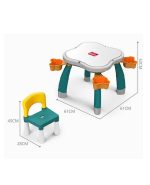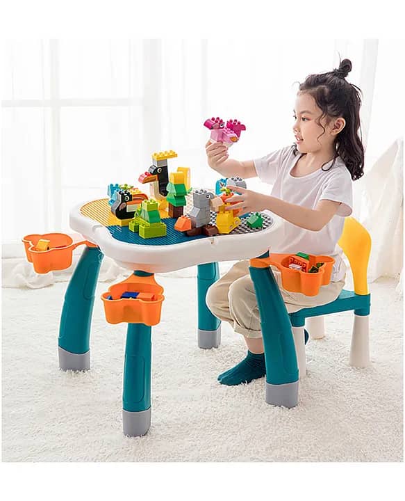 Enter the magical forest with this sturdy 100 pieces multi functional block table and chair. Build your own group of animal friends with ease of picking up toys from 360 degree rotating block holder. Learn colours and numbers when you match blocks with detailed decoration. The attached heightened foot cover will not scratch the surface and makes it easy to move the table. The multi-functional table can be used as a study table, game table, dinner table, toys table, blocks table, painting table, and storage box