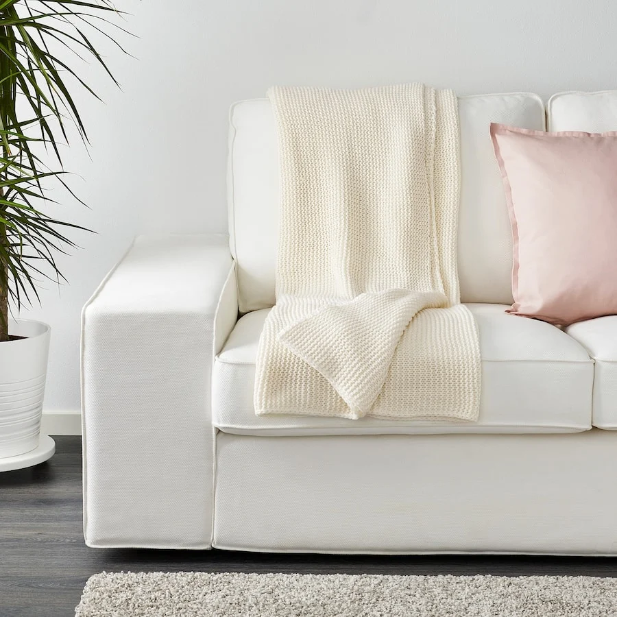 This off-white knitted throw in acrylic and cotton is nice to wrap around you to feel cosy on the balcony or on the sofa indoors. A lovely and warming splash of colour that feels soft against your skin.