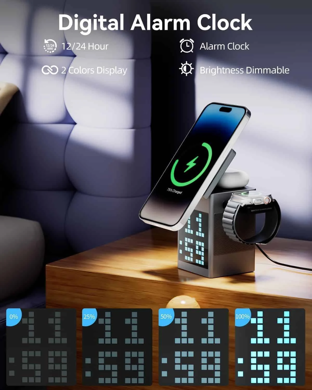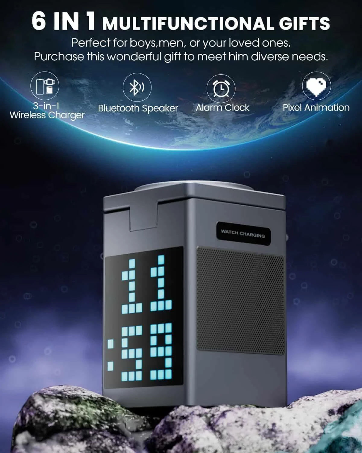 Pixel Display, Alarm Clock, Bluetooth Speaker, Magnetic Charging, Wireless Charging