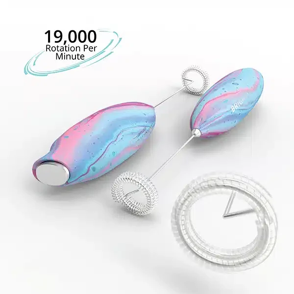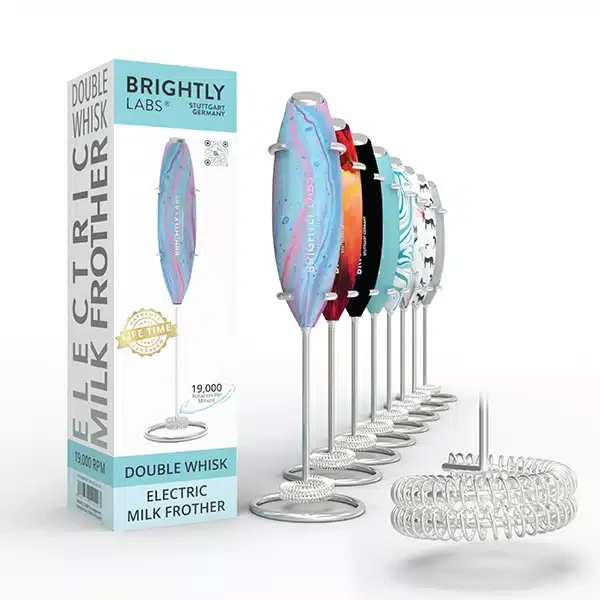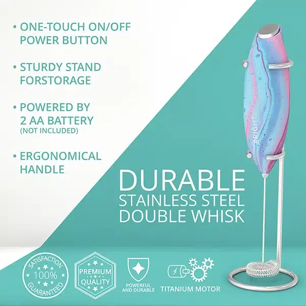 Clean, Store and Operate: The durable, convenient metal stand gives easy access for foamy goodness in seconds. Cleanup for this matcha whisk & frother is even faster. To clean just put the whisk in hot running water and briefly turn it on – instantly clean! When stored on counter or table it sits nicely next other coffee accessories. Our powerful and durable hand-held milk frother is powered by two AA batteries (not included) with a compact electric design that easily fits in a drawer.