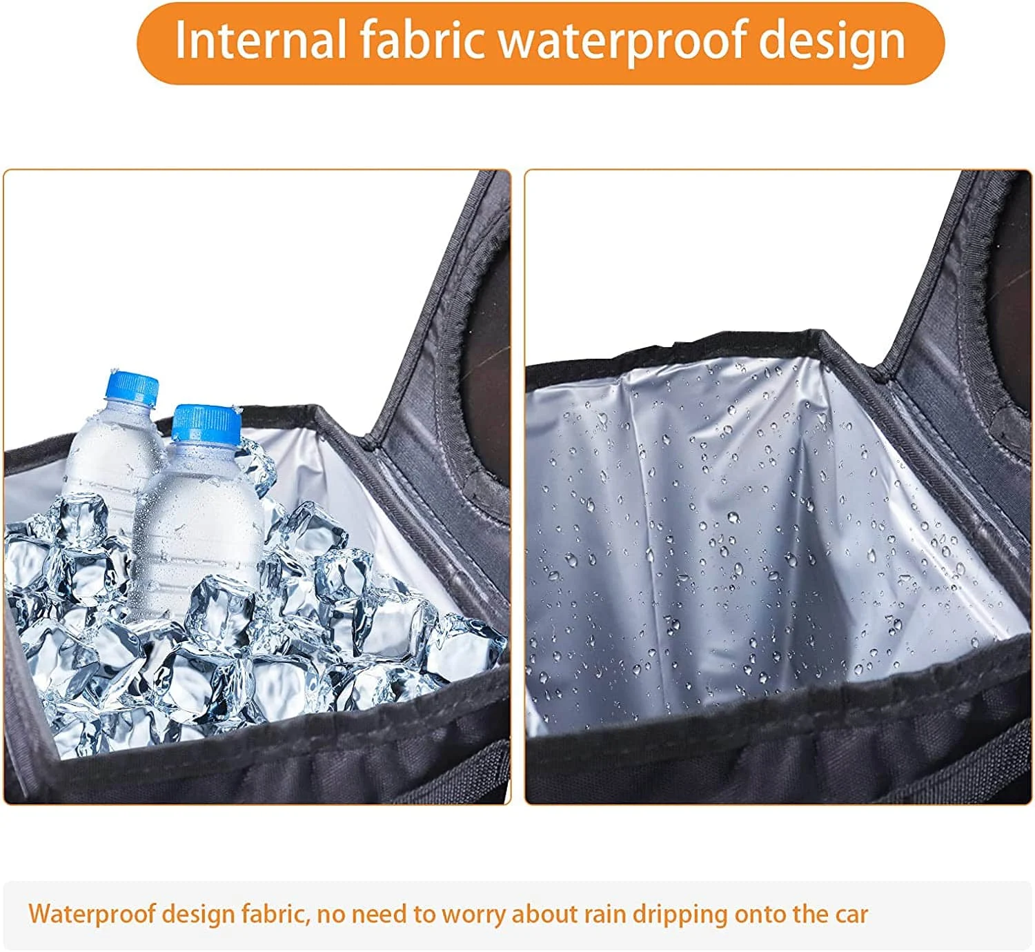 [VERY PRACTICAL CAR TRASH CAN]: Our product is not only a tcar rubbish bin, but also can be used as a car storage organiser. There are 2 mesh pockets and 1 front pocket on car bin for you to organize small items. You can also use it as a cold storage bag. The heat-insulating and waterproof lining can hold ice cubes, keeping beverages and food at low temperatures in the car for several hours.