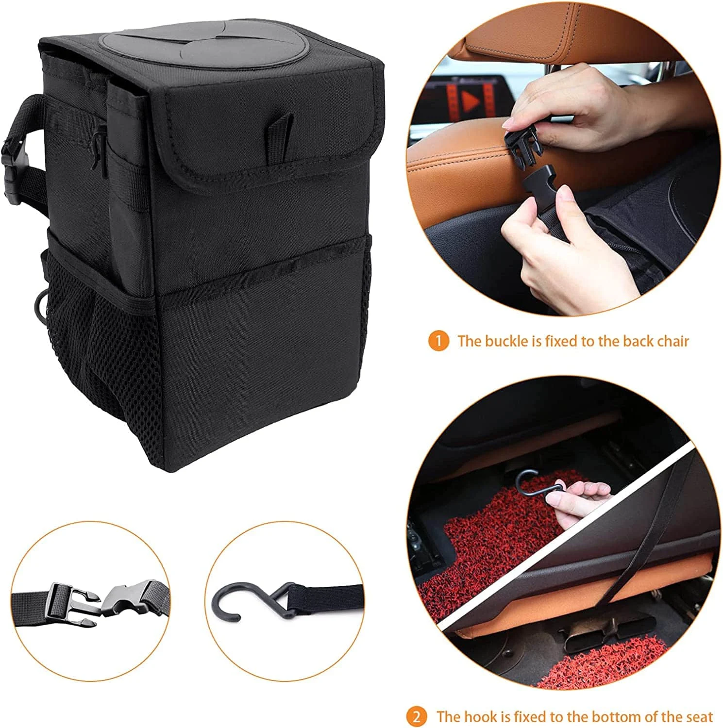 [EXQUISITE AND THOUGHTFUL DESIGN]: You will really like the elastic opening lid made of soft PU leather flap with velcro seal. You can load empty water bottles, peels and other garbage without opening the lid, and you will never have to worry about odors. Adjustable clips on both sides of car storage organiser can fix the plastic bag, remove and replace when full.