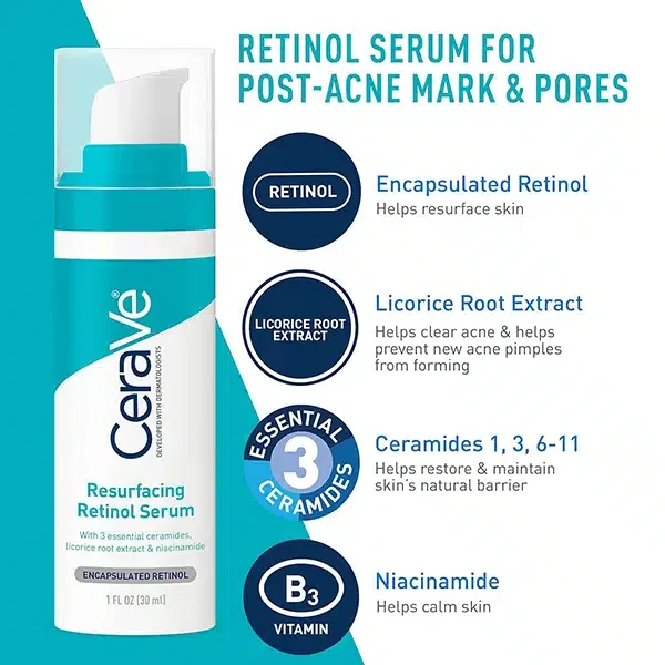 - CeraVe Resurfacing Serum contains retinol to help reduce the appearance of post-acne marks and visible pores overtime. In fact, our consumer study shows 8 out of 10 women agree that skin texture looks more refined and smoother.*