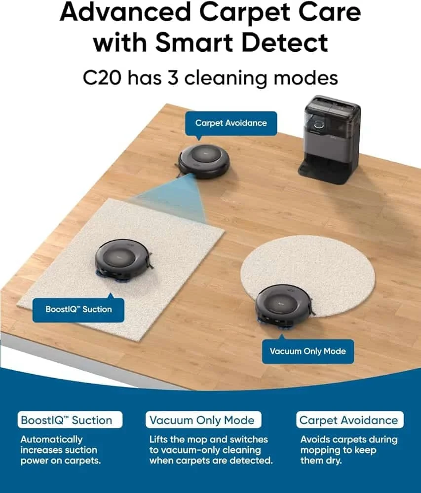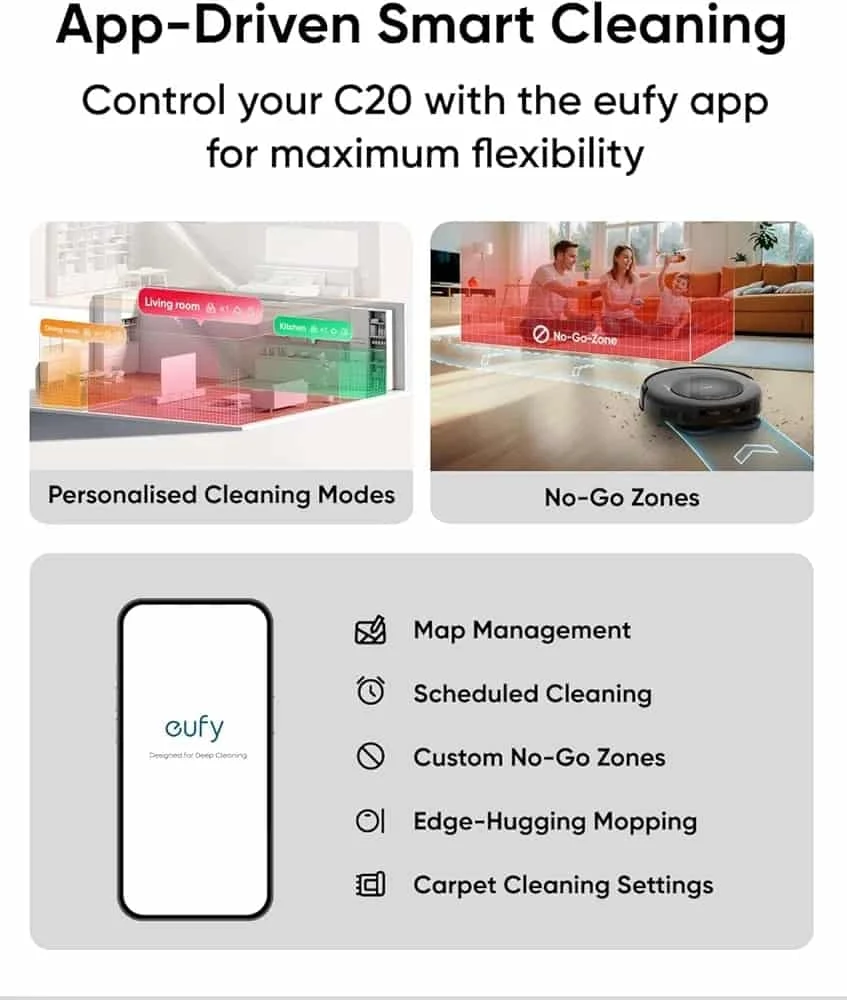 3.35-inch Ultra-Slim Body: Its ultra-slim 3.35-inch design allows the C20 to reach tight spaces, like under desks and beds, ensuring thorough cleaning in hard-to-reach areas and reducing manual cleaning in low-profile furniture spaces.