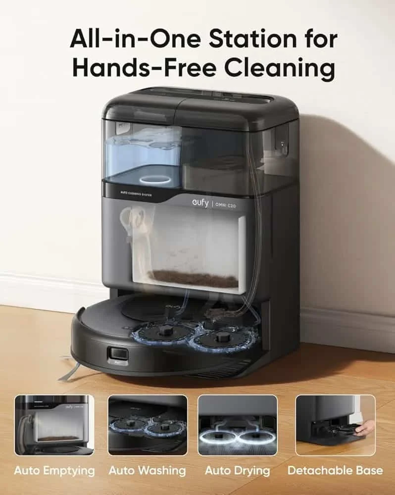 All-in-One Station: eufy Robot Vacuum Omni C20 offers fully automated cleaning with features like auto emptying, washing, drying, and water refilling. The station dries the mop with room-temperature air and has transparent water tanks, allowing you to easily monitor water levels without opening them. This hands-free system ensures effortless maintenance.