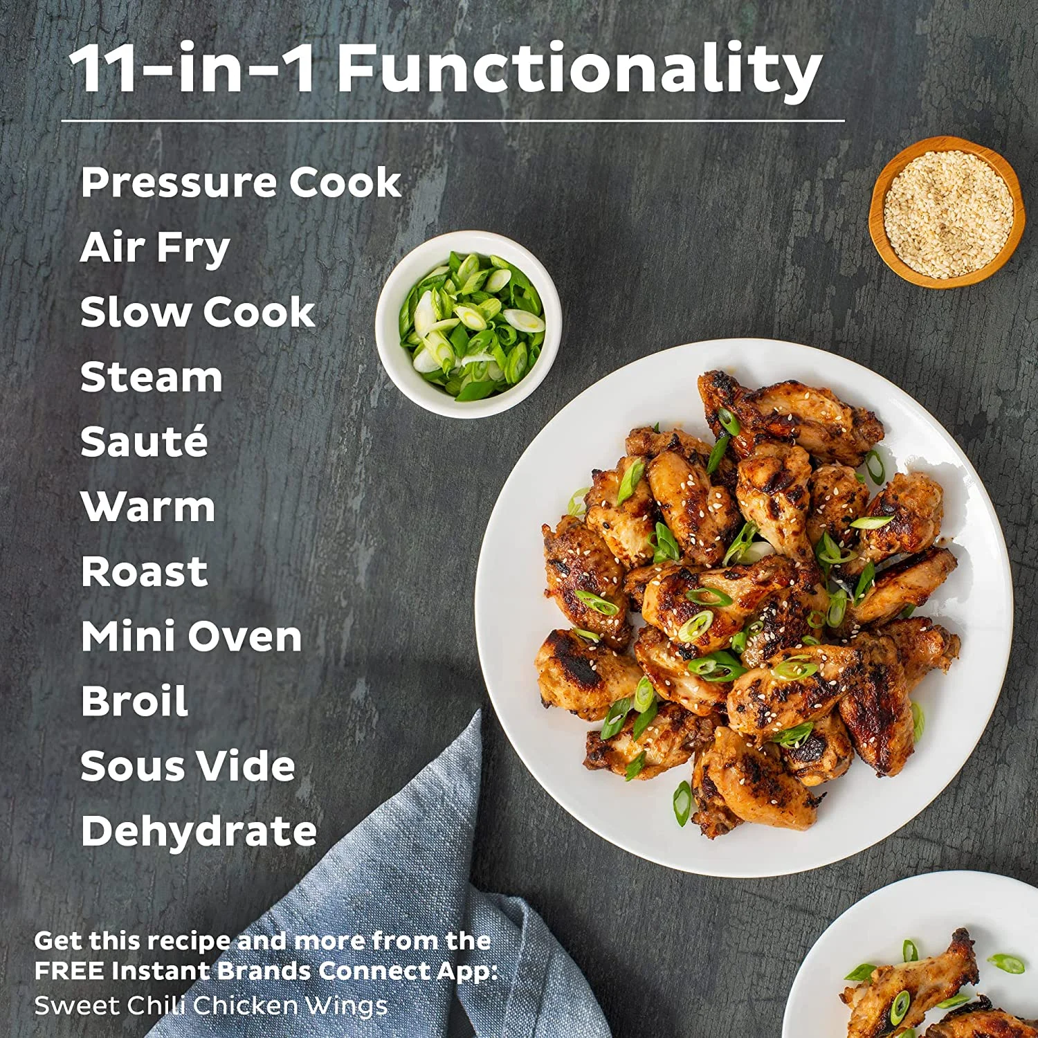 - QUICK ONE-TOUCH COOKING: 11 customizable Smart Programs for air frying, pressure cooking ribs, soups, beans, rice, poultry, yogurt, desserts and more. Includes free app with over 1900 recipes!