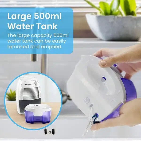 SMALL & COMPACT: Pro Breeze dehumidifiers for home are lightweight, compact and portable. Unlike cheaper moisture absorber bags, this dehumidifier is capable of removing up to 250ml of moisture per day and has a 500ml water tank capacity.