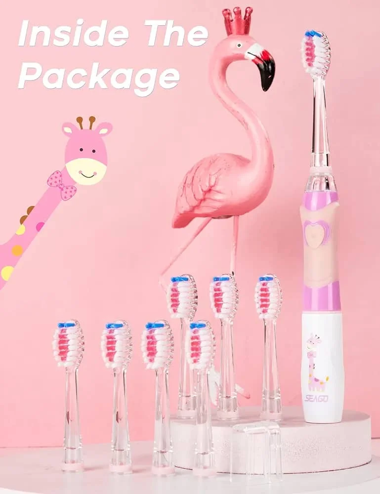 【Fun Kids Electric Toothbrush】The giraffe-patterned junior electric toothbrush and the rainbow led lights was design to give children the pleasure of brushing their teeth. W shape soft bristles help clean hard reach are thus cleanning the mouth more effectively