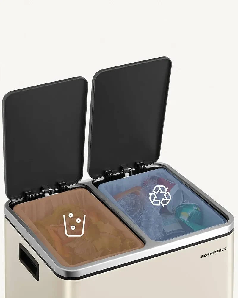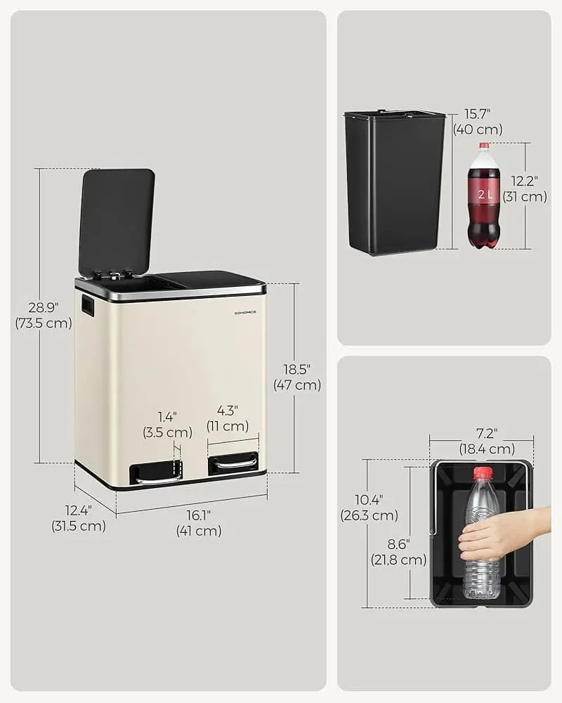 - [Delights Small Kitchens] With two 15 L compartments, this pedal bin fits perfectly in compact kitchens, apartments, or smaller homes and helps manage recycling and trash in one convenient receptacle